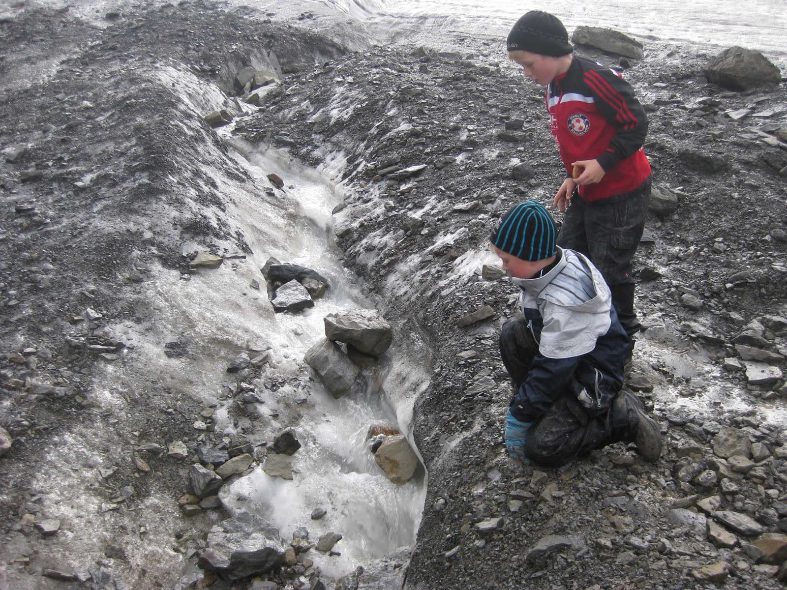 Vel oppe på breen var det veldig moro, en liten elv som rant gjennom isen var flott lekeplass for guttene, og når vi hadde med oss kjeks, epler og Kvikk-lunch kunne ikke stemningen bli bedre.